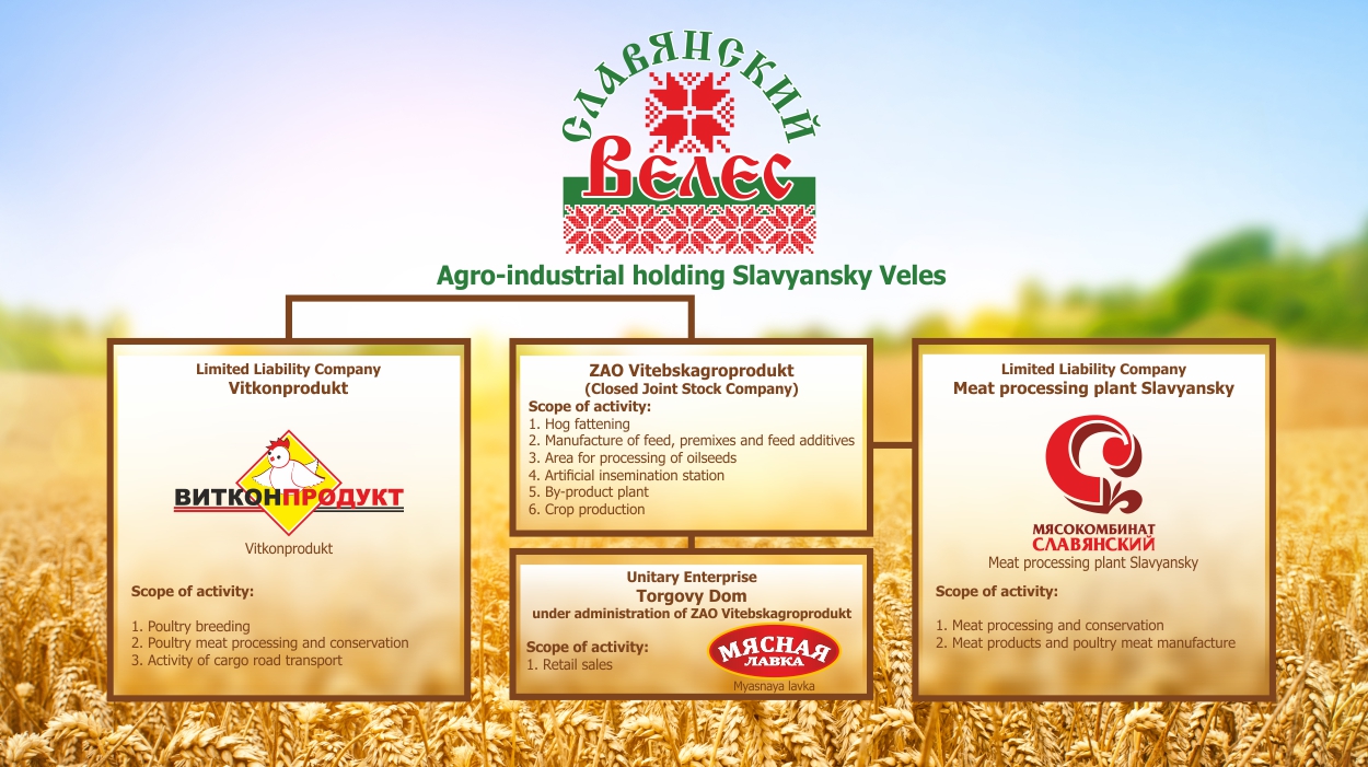 Agro-industrial holding Slavyansky Veles which was founded in 2011, is currently one of the leading manufacturers and suppliers of meat products in the Republic of Belarus. The agro-industrial holding includes such significant enterprises of Vitebsk Region as ZAO Vitebskagroprodukt (Closed Joint Stock Company), OOO Vitkonprodukt (Limited Liability Company), OOO Meat processing plant Slavyansky (Limited Liability Company) and UE Torgovy Dom under administration of ZAO Vitebskagroprodukt.