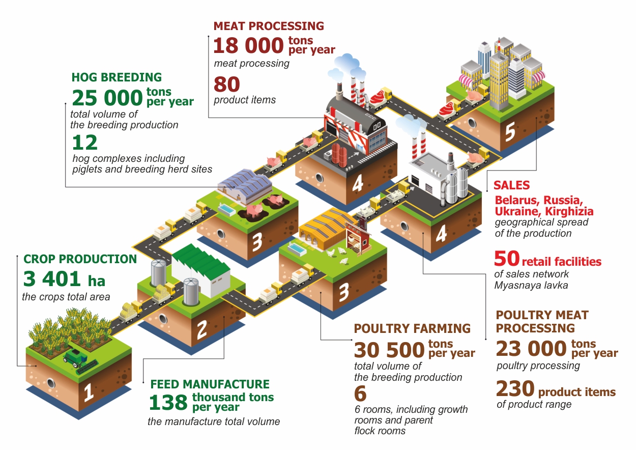 The specific activities of the holding companies are quite broad and include breeding and processing of broiler chickens, fattening of highly productive hogs and pork production, the cultivation of crops, the manufacture of feed stuffs, meat and meat products retail sales. In actual practice, the enterprises that are part of the agro-industrial holding which carry out a full production cycle "from field to market", that allows to a certain extent to be independent of the conjuncture of various commodity markets and changes in prices for certain types of raw materials, optimize the cost of production and minimize possible risks.